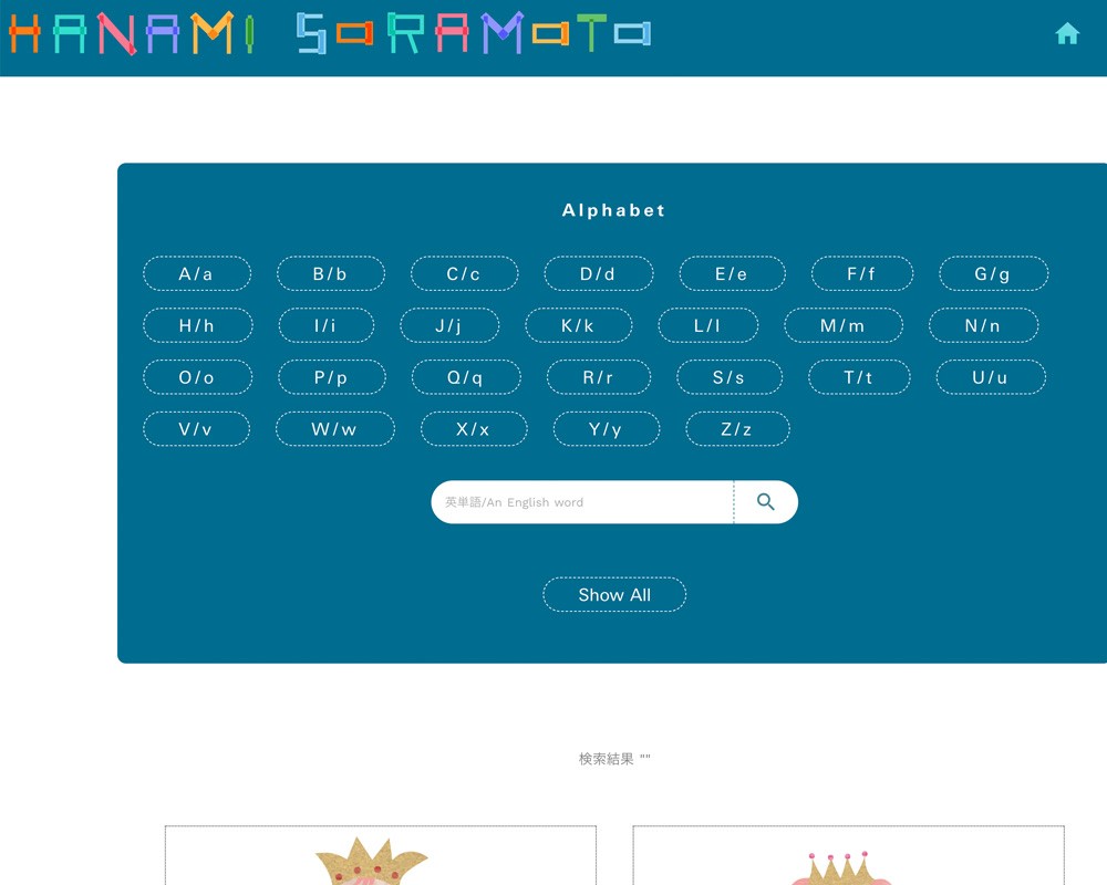 イラストを引き立てるシンプルな構成にし、ユーザーが分かりやすく操作できるように心がけました。原色やパステルカラーの多いイラストなので、背景色をくすんだ群青色にしました。シンプルな構成に対して、ユーザーが楽しめるようにイラストページは辞書のように検索ができるように工夫しました。